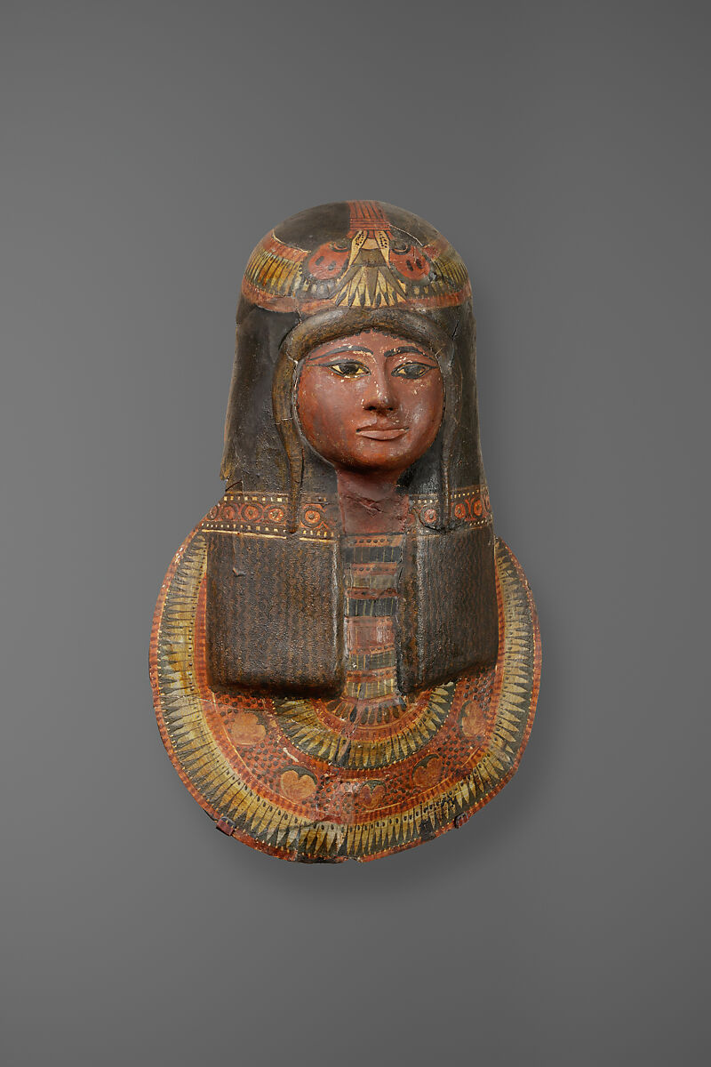 This elegant mask of cartonnage was placed over the head of Iineferty's mummy. She is shown wearing a long braided wig with decorative bands just below chin level and a floral fillet surmounted by a lotus blossom, symbolic of rebirth. Her face is framed by separate locks of hair that end in thin pigtails, characteristic of the late 18th and 19th Dynasties. The lower part of the mask takes the shape of a floral collar that would have fit over Iineferty's shoulders.