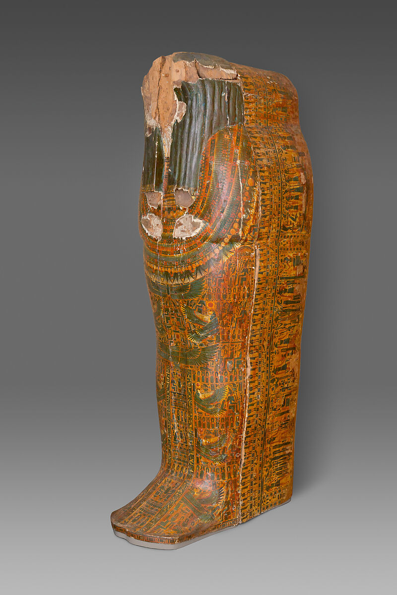 Her burial assemblage includes this painted coffin, which contained an inner coffin and a mummy board; an Osiris shroud; leather braces; amulets; viscera figures; two funerary papyri; an Osiris figure; two wooden shabti boxes, and several hundred shabti figures. A heart scarab (see 25.3.162) and a metal falcon amulet (see 25.3.160) had been placed on her chest, but these were stolen in antiquity.