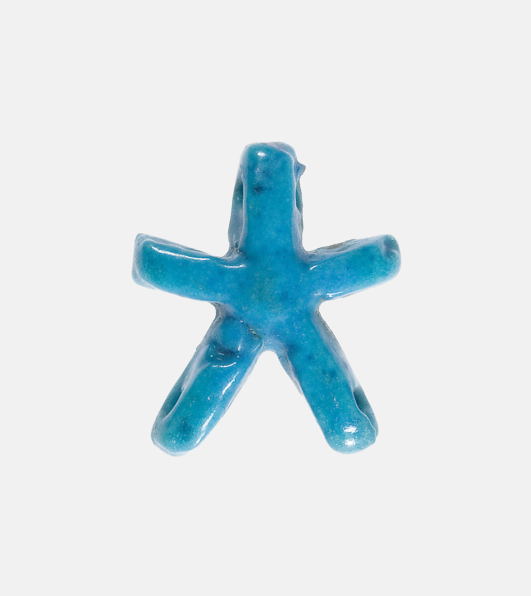 This small five-pointed star features piercings at the top and bottom for horizontal strings. The star was probably a jewelry element that was part of a larger piece, such as a broad collar, which was usually made from many small separate pieces strung together (see 40.2.5).