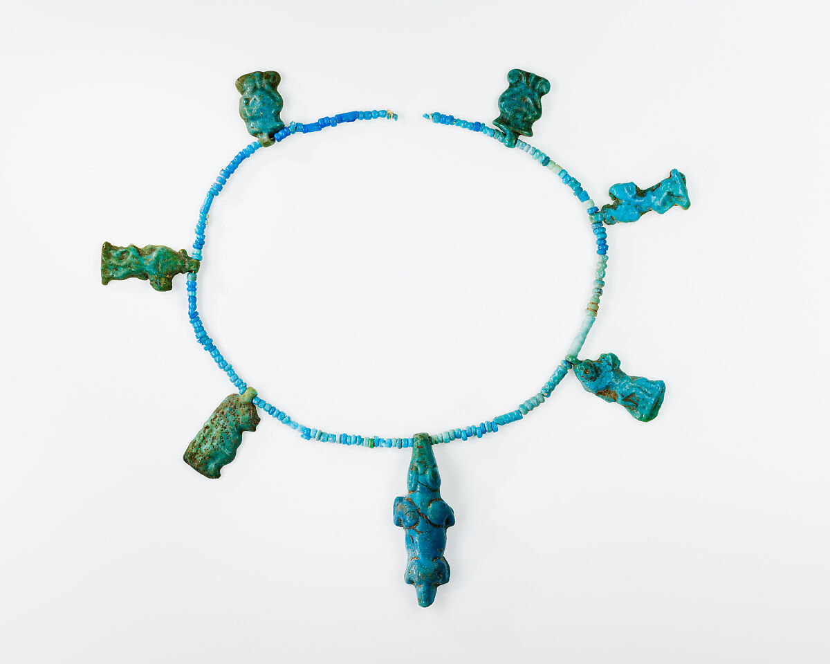 These amulets were found together in a pot that was in the same house as the Menat necklace 11.215.450. They were strung together with the small blue beads to keep them together.