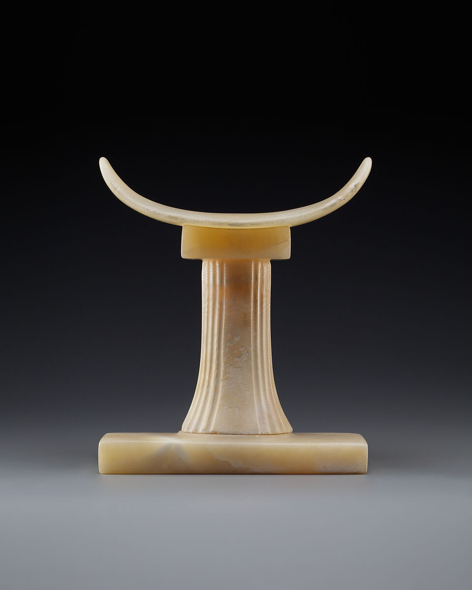 This stone headrest was excavated in a wealthy official’s tomb. It appears to have been designed solely for use in the afterlife as its components—pillow, column, and base—were glued together instead of joined using a mortise and tenon mechanism that structured the more common wood examples. Headrests mimicked the sun (the head) rising in the horizon (the headrest’s pillow). Therefore, waking up would have been seen as rebirth for the sleeper, like the sun’s morning appearance was for the world. Many headrests show wear and have impressions from, or actual scraps of attached linen, indicating they were padded for comfort. Although pillows existed, a headrest was cooler and elevated the sleeper’s face away from the insects and scorpions that prowled in the night.