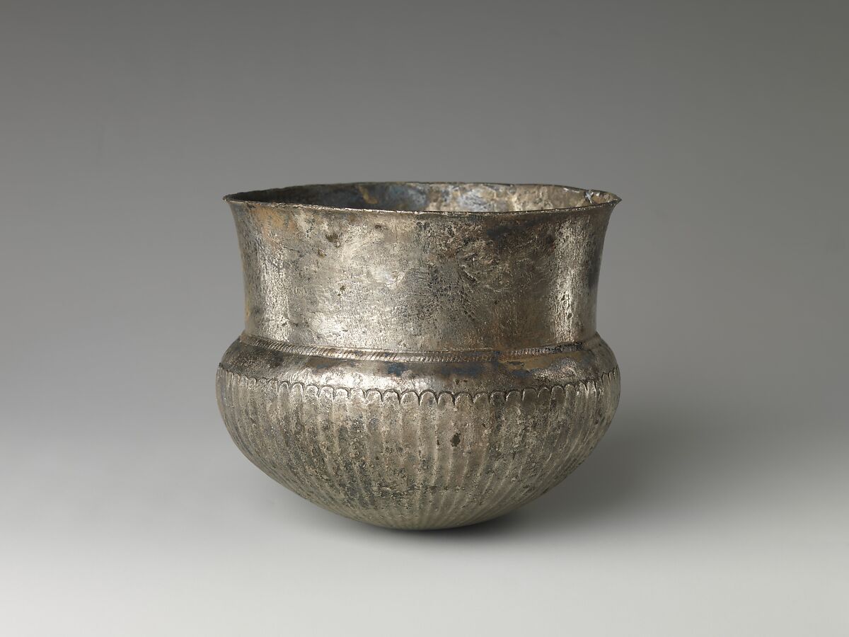 The heavy silver vessels 18.2.13-18.2.17 are in created in a decorative style widespread in the Greek world, and can be dated to the fourth century BC. They. are said to have been found together in the Egyptian Delta.