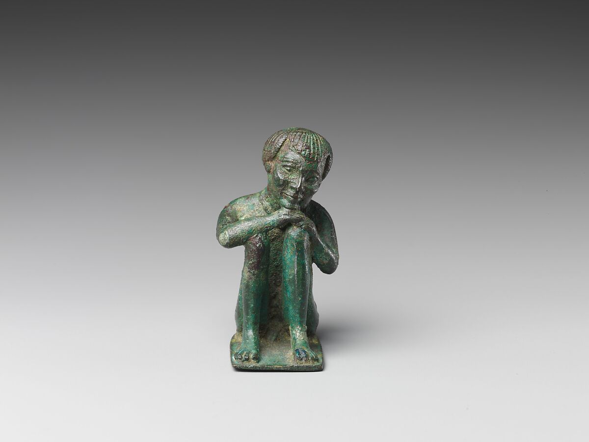 This statuette belongs to a late type from Egypt seen in limestone or bronze depicting a nude individual resting with his hands and head on one or both knees. One interpretation connects these with mourners depicted in earlier tomb reliefs. There are also small faience figures from Rhodes sometimes termed 'temple boys'' that are related in pose, as well as Hellenistic statuettes of 'Ethiopians' apparently representing crouching and waiting servants.