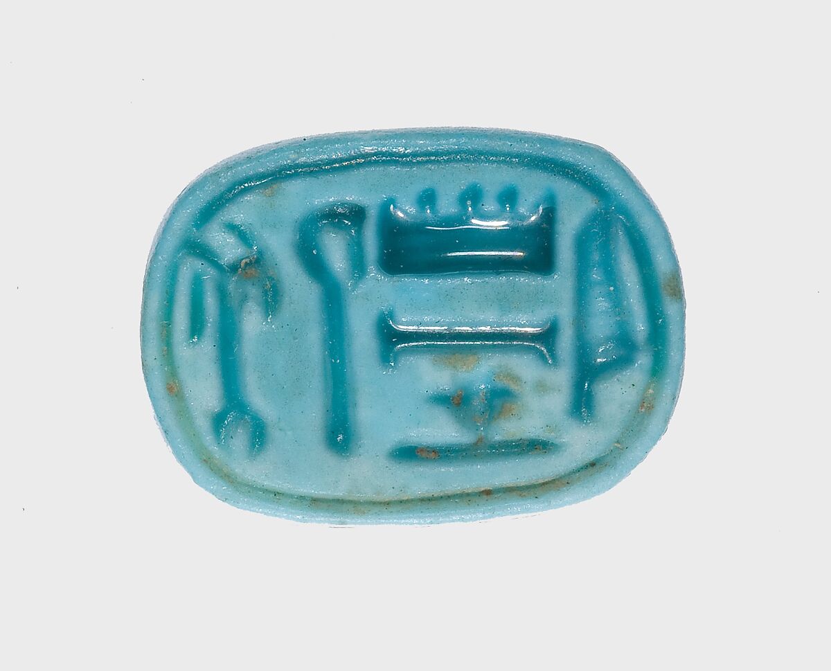 This oval plaque has been inscribed with the two most commonly recorded names of Amenhotep III: his throne name, Nebmaatre, and his personal name, Amenhotep, which is accompanied by the epithet Ruler of Thebes.