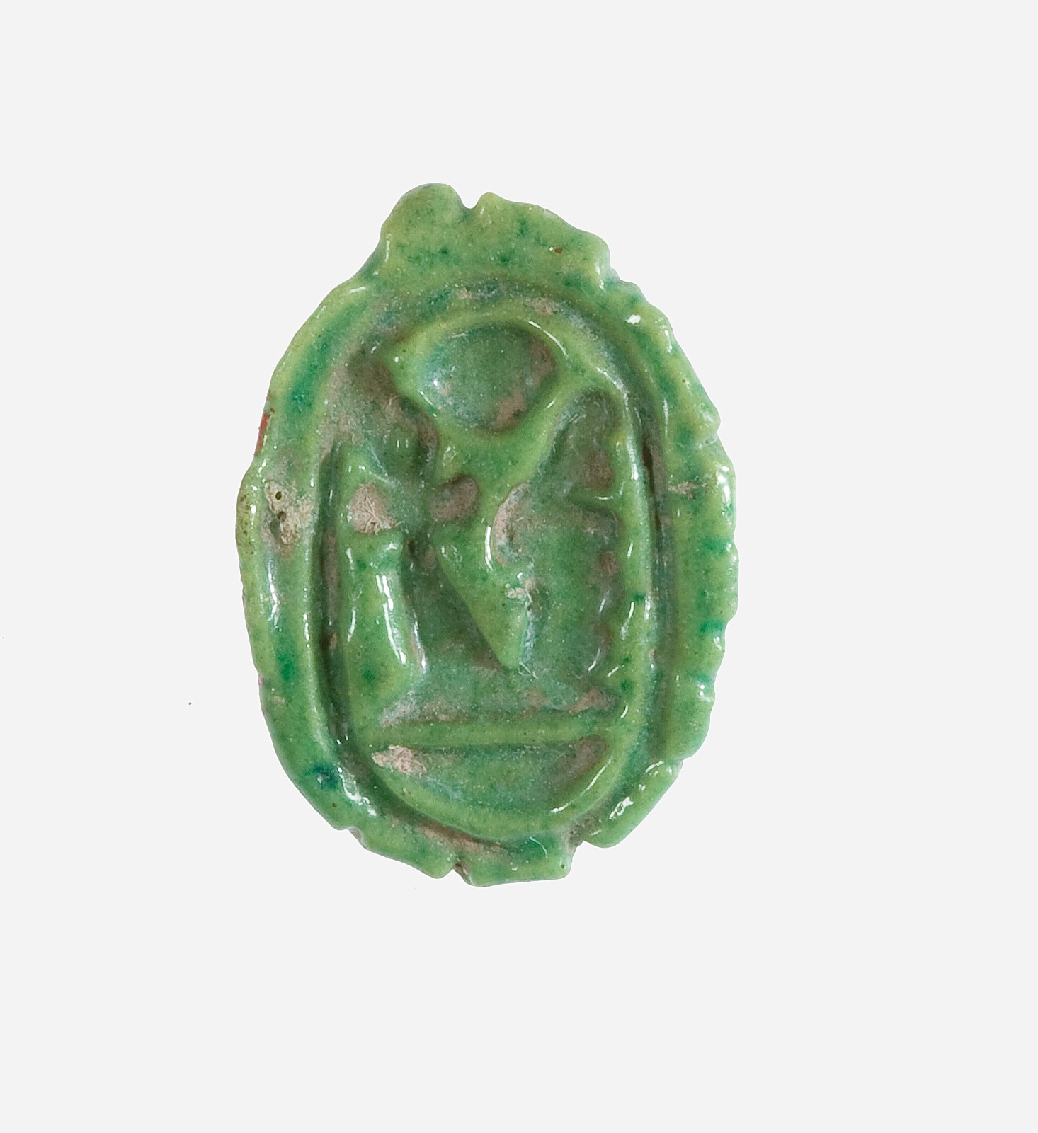 This scarab was made by pressing faience paste into a pottery mold. Before the paste was dry, a stamp inscribed with the throne name of Amenhotep III (Nebmaatre) was pressed onto the base, pushing some of the material over the edge of the mold. This excess material was never trimmed, leaving the ragged outline.