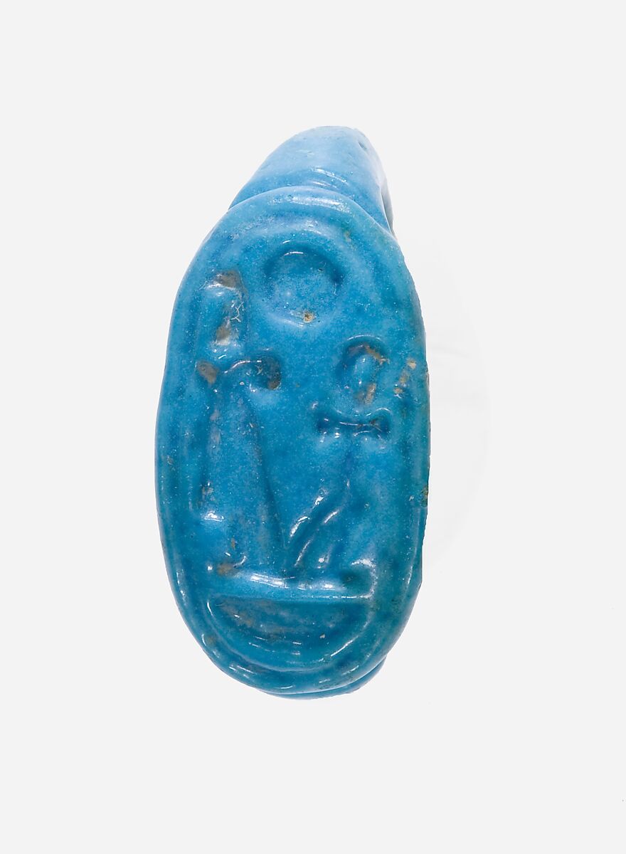 Many complete and fragmentary faience rings were excavated by the Museum at Malqata, which is located on the west bank of the Nile opposite the modern city of Luxor. Malqata was the site where Amenhotep III celebrated his three rejuvination festivals (called heb-sed in ancient Egyptian). This ring is inscribed with the king's throne name, Nebmaatre, which means "Re (the sun god) is the lord of truth." A clearer rendering of the name may be seen on another blue faience ring that was also excavated at Malqata.