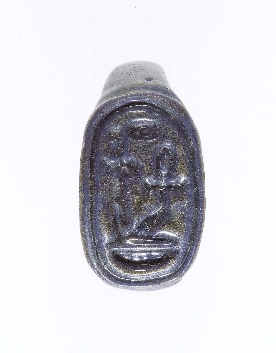 Many complete and fragmentary faience rings were excavated by the Metropolitan Museum's Egyptian Expedition at Malqata which is located on the west bank of the Nile oposite the modern city of Luxor. Malqata was the site where Amenhotep III celebrated his three rejuvination festivals. This ring is inscribed with the king's throne name, Nebmaatre, which means "Re (the sun god) is the lord of truth." The dark blue color is unusual, though it occurs quite frequently at the site. A clearer rendering of the name may be seen on a turquoise blue faience ring that was also excavated at the site.