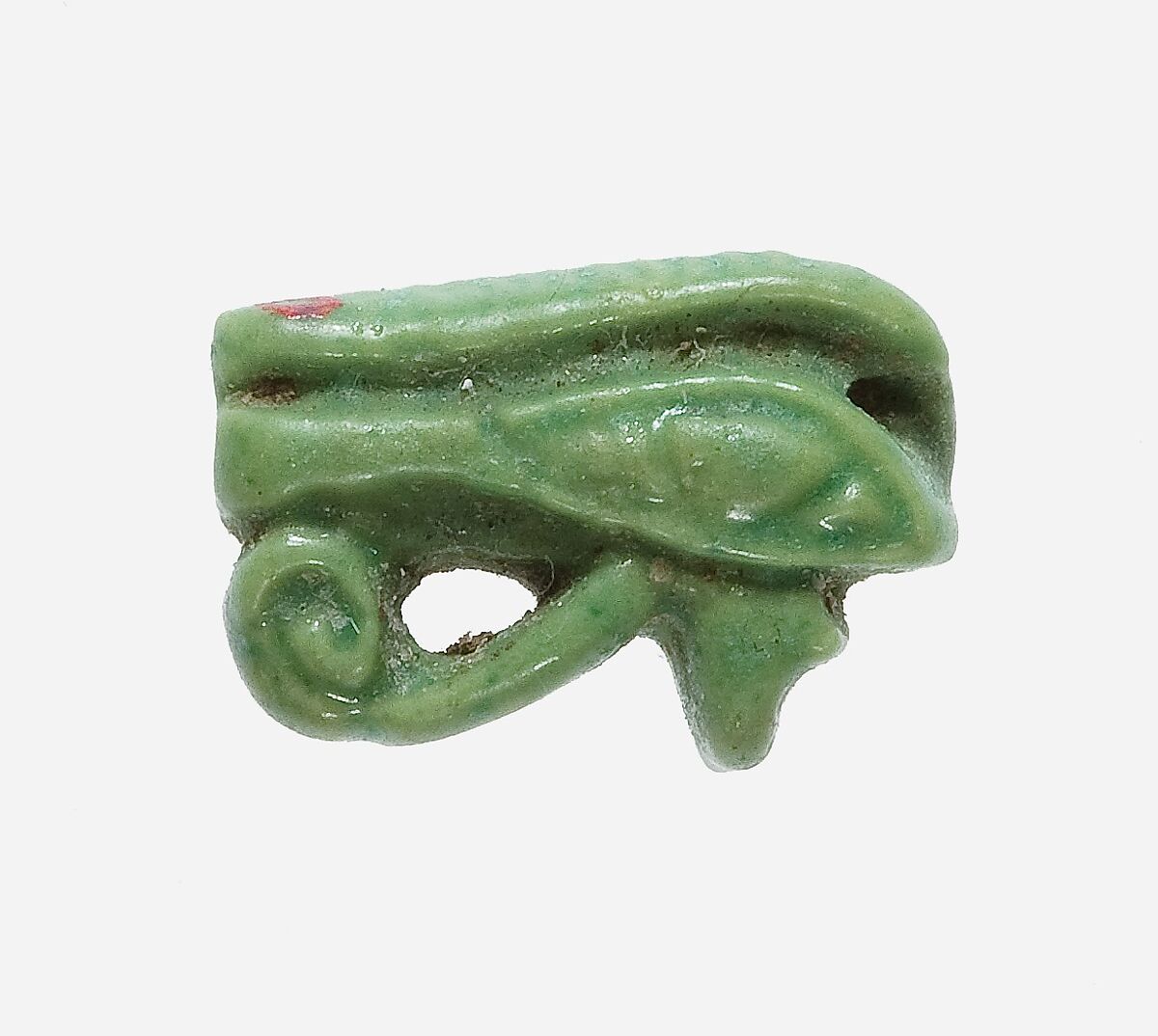 This particular wedjat eye shows the typical style of the New Kingdom, in which the spiral element sits directly underneath the cosmetic line, while in later examples it is situated much lower (see for example 89.2.415).