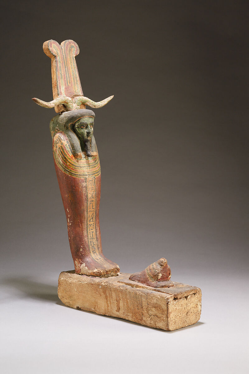 This mummiform figure represents the funerary deity Ptah-Sokar-Osiris. On his head are two ostrich plumes flanking a sun disk, and two ram's horns. The inscription down the center of the body tells us the figure was made for a priest of Osiris whose name is unfortunately effaced. The inscription continues on the back, where the name of the owner's father, a High Priest of Horus of Edfu named Padia-abehdet, is preserved.