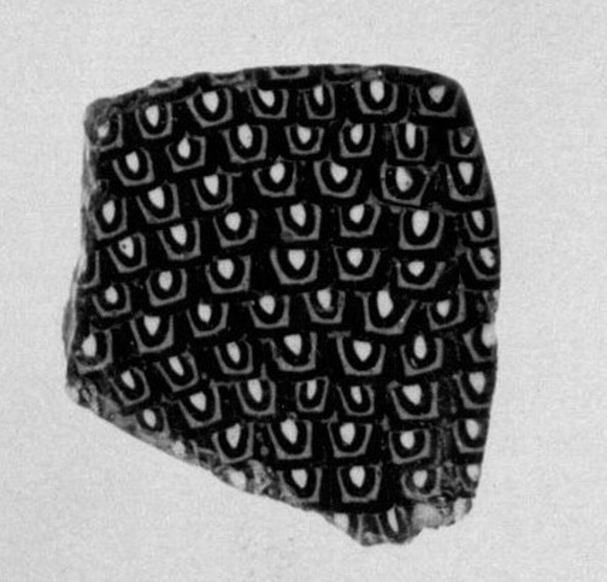 A mosaic glass technique allowed multiples of an image to be created: a figural or design composition was made by bundling colored glass canes, which were then drawn out into a long bar. The bar was then sectioned at right angles, probably by striking the bar with appropriate tools, to produce small inlay tiles. The tile would then be smoothed and polished on the face intended to appear outwards.