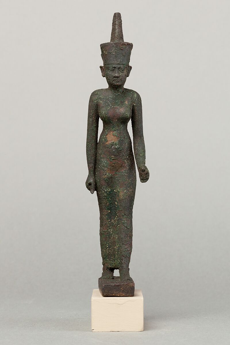 Neit was a powerful goddess with many different aspects, but was perhaps best known in the first millennium BC as the goddess of the powerful city of Sais in the Delta. In copper alloy she is represented in anthropomorphic form. She wears the red crown, otherwise known as the Lower Egyptian crown, and the long form-fitting dress common to many goddesses. Her arm position suggests that she may have held a scepter in her outstretched hand and perhaps an ankh sign in the other. Sometimes on more elaborate figures, her crown is striped, usually with precious metal inlay, as seen on 26.7.846. The base had an inscription, but it is now illegible.
