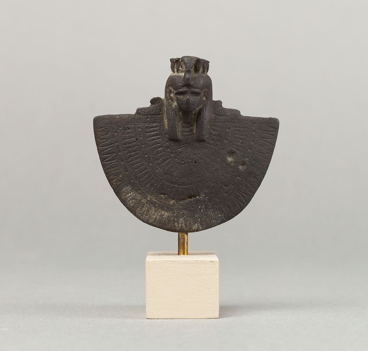 The aegis is an object that comprises the bust of a deity with a broad collar below it. Broad collars are generally accompanied by a menat, a counterpoise that hangs at the back of the neck, balancing the weight of the heavy, elaborate collar on the chest. Although this piece only shows the deity’s head and broad collar, it represents the aegis-menat combination, which was not only a personal adornment but also played an important role in cult. It was a protective symbol and was used in rituals and festivals; the head allowed the deity to inhabit the ritual instrument and thus take part in the ceremonies.