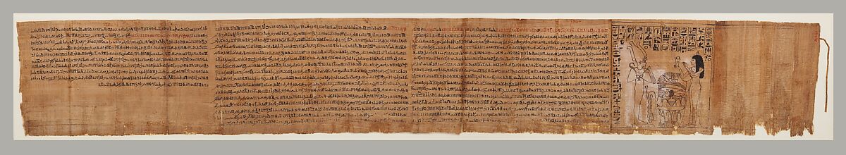 Discovered inside Henettawy's Osiris figure (25.3.35a, b), this papyrus had been tightly rolled and tied with a tape of papyrus on one side.The scroll starts on viewer right with a painted vignette showing Henettawy presenting a jar of ointment to a figure of Osiris, captioned with carefully drawn hieroglyphs. The remainder of the papyrus is filled with columns of text written in a cursive script called hieratic. These are chapters from the Book of Coming Forth by Day (known as the Book of the Dead), each headed by a title in red ink. The drawing and hieroglyphs in the scene were done by one draftsman, the hieratic text by another.