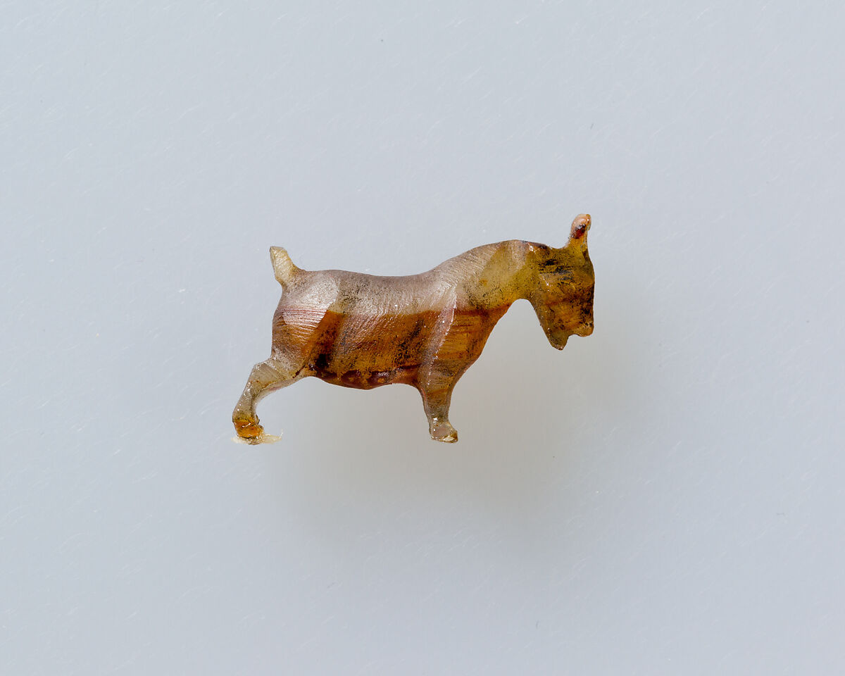 This is one of a small group of animals carved in semiprecious stones from the Davis Collection that share share a general liveliness and more Hellenistic than Egyptian style. Alongside subjects that are familiar in Egyptian iconography such as a baboon and ducks, are others like a goat, dolphins, rhinoceros, galloping horse, and reclining hound that are more at home in the Greco-Roman sphere.