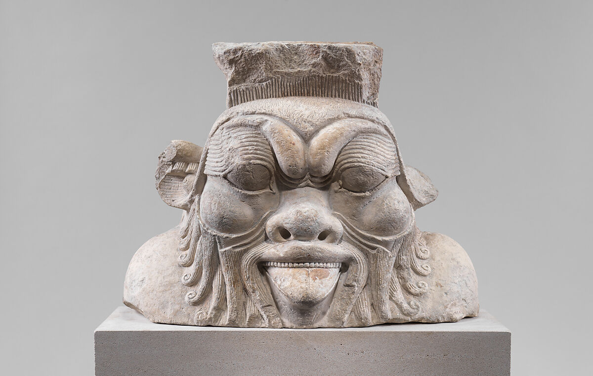 This large head unmistakably depicts the god known as Bes, or, more accurately, what is known as a "Bes-image," since Bes's appearance was sometimes adopted for other gods, and there is no name preserved on the statue. From the Kushite Period onward, images of Bes appeared on architectural support elements such as abaci, column shafts, or, rarely, large two-sided pillars. These architectural images are especially associated with mammisis, or temples celebrating the birth of a child-god; it is thought that this is related to the long association of the deity with domestic concerns and fertility. Such Bes figures are typically frontal and carved in high relief, but the depth of this figure against an abacus or shaft surface, if that is actually its origin, would have been quite unusual.