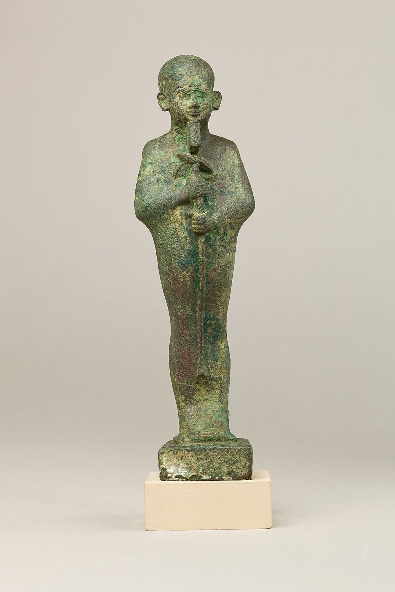 This statuette depicts Ptah, the chief god of Egypt's capital city Memphis and master craftsman of the gods. He is easy to identify by his tight-fitting cap, straight beard (different from the usual curved divine beard on other gods), and enveloping garment. The garment has a stiff upper edge along the back of the neck, a feature that occurs with some regularity also on Osiris statuettes, but its meaning is unclear. A shallowly carved oval area on his chest brings his hands and scepter into sharper relief, and may be intended to represent slits in the cloak itself. Commonly Ptah holds a scepter that combines the symbols for life (ankh), dominion (was), and stability (djed), but here he holds only the was scepter. Ptah was a benevolent and approachable god, characteristics that may have inspired his devotees to dedicate numerous representations of him in the Late and Ptolemaic Periods.
