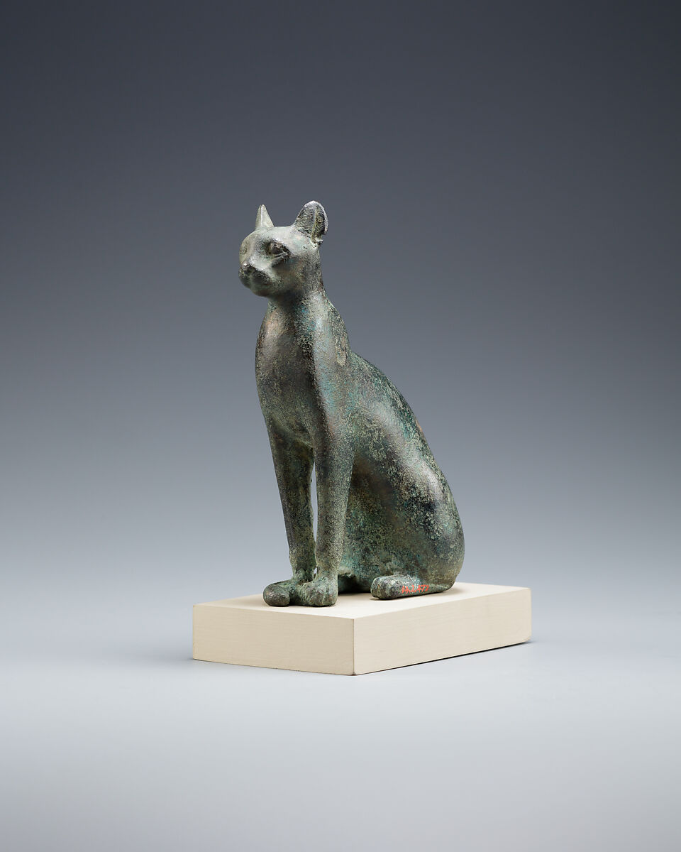Cat statuettes were among some of the most common zoomorphic dedications of the Late and Ptolemaic Periods. Small statuettes would have been dedicated as offerings to temples or deposited in catacombs alongside cat mummies, as at the extensive catacombs at Bubastis and Saqqara. Sometimes larger hollow examples held a cat mummy inside.
