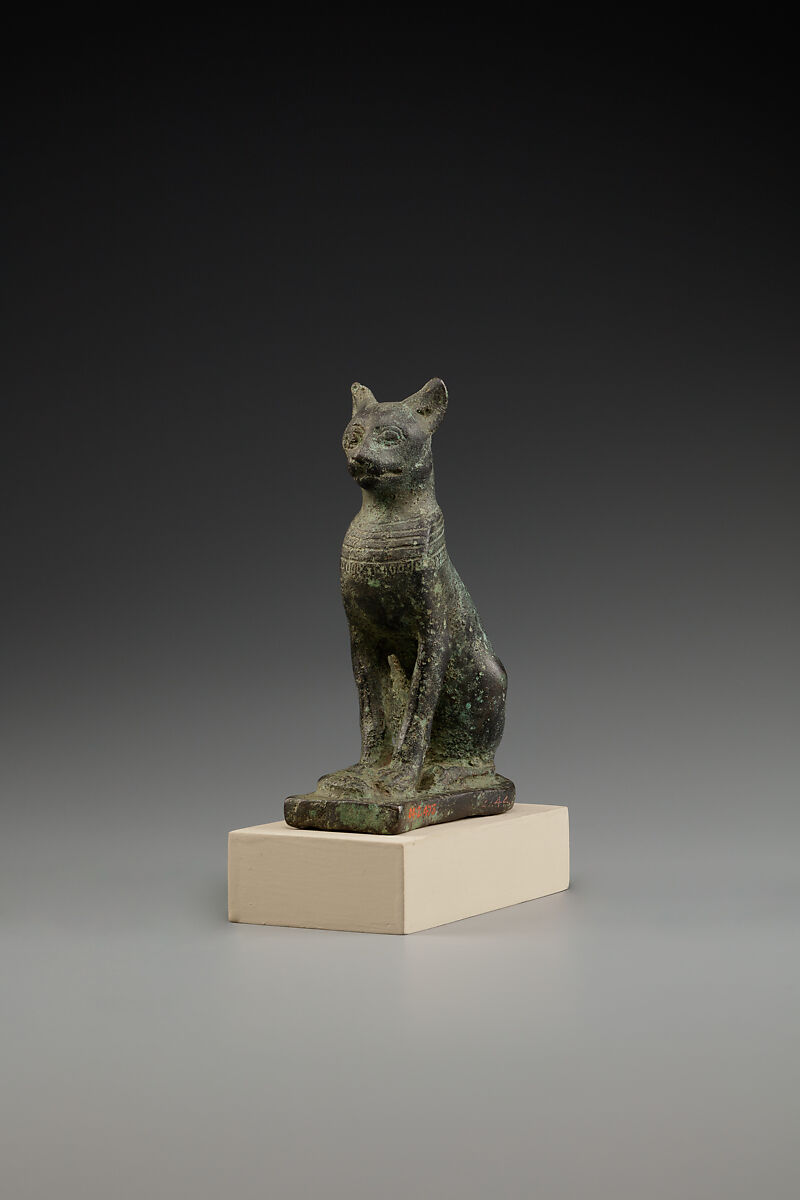 Bastet was a powerful goddess of Lower Egypt, one who was protective and could bring about great prosperity. In zoomorphic form, she was represented as a cat and cats were considered sacred to her. As a cat, she sits upright, poised and alert, on guard against external forces. Cat statuettes like this one were among some of the most common zoomorphic dedications of the Late and Ptolemaic Periods. Small statuettes like this one would have been dedicated as offerings to temples or deposited in catacombs alongside cat mummies, as at the extensive catacombs at Bubastis and Saqqara. Sometimes larger hollow examples held a cat mummy inside.