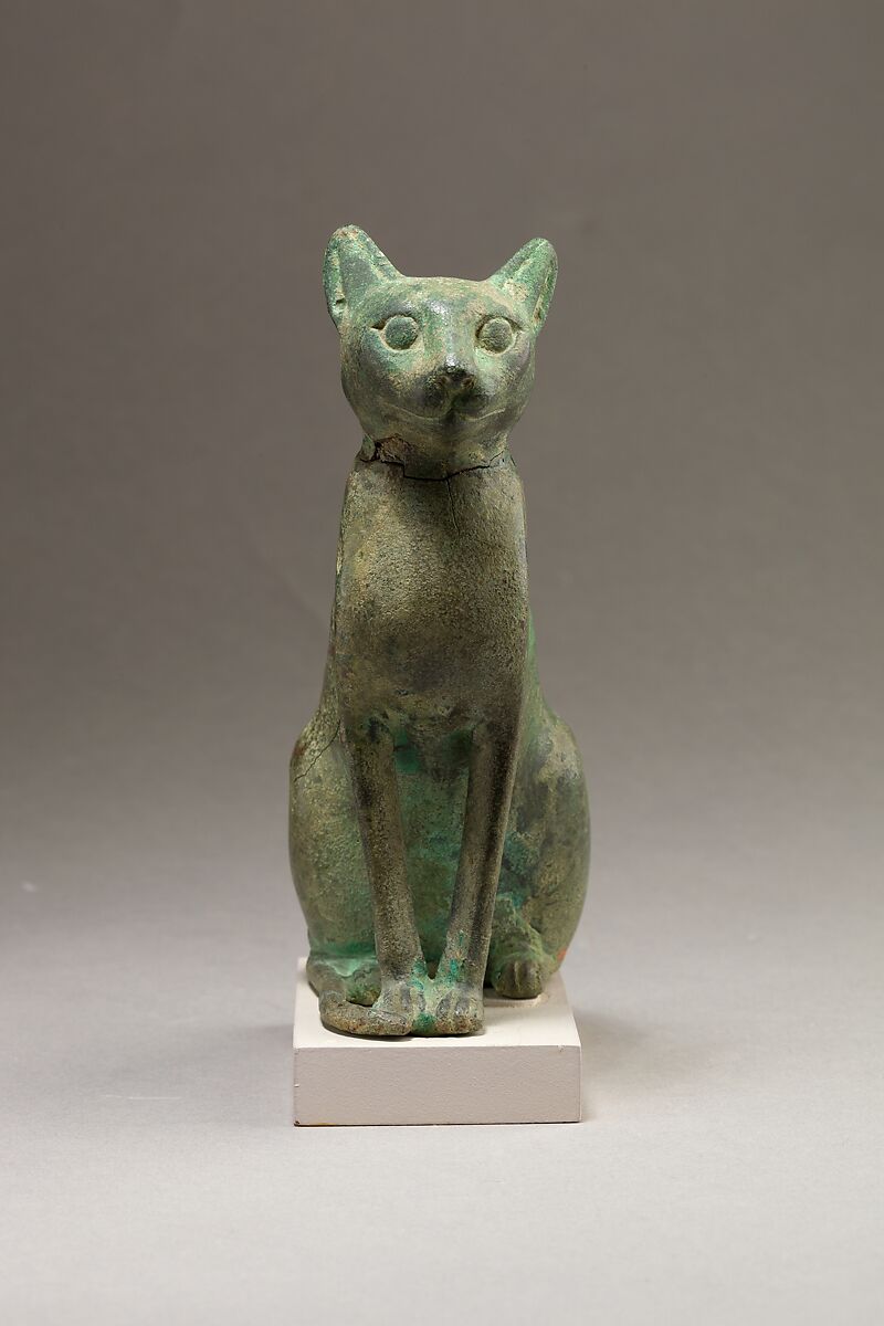 Cat statuettes were among some of the most common zoomorphic dedications of the Late and Ptolemaic Periods. Small statuettes would have been dedicated as offerings to temples or deposited in catacombs alongside cat mummies, as at the extensive catacombs at Bubastis and Saqqara. Sometimes larger hollow examples held a cat mummy inside.
