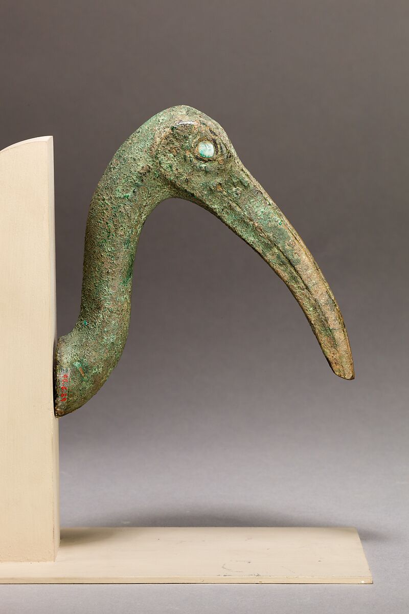 Inlaid vitreous material in the eyes gives this ibis head a life-like and alluring appearance. This elegant bird was sacred to Thoth, the god of wisdom, scribal functions, and learning. Representations of the ibis in cupreous metal are some of the most numerous sacred animal statuettes, alongside the cat, falcon, and Apis bull. The prevalence of the ibis during the first millennium BC, and the appeal of animal cult in general, can also be seen in the thousands of surviving ibis mummies, which were offered in animal necropoleis (catacombs) throughout Egypt.