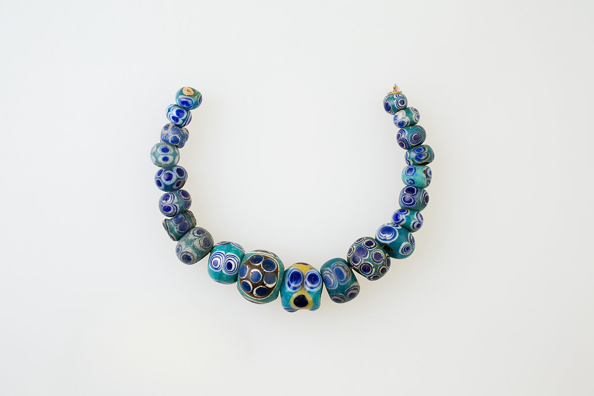 Mosaic glass beads had long been popular in Egypt. The period of large intercontinental empires beginning about 500 BC initiated a period of widespread trade of these small items. These are all modern stringings; most ancient stringing patterns are lost as the string decays.