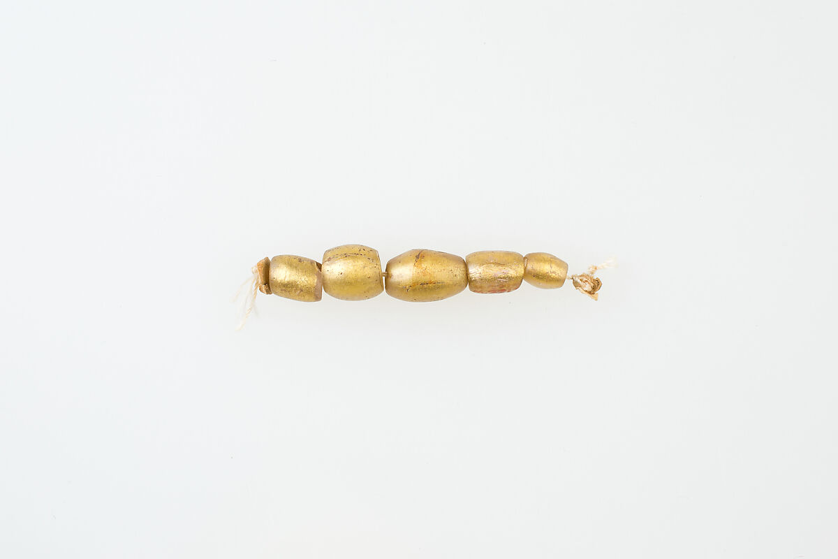 Gold glass beads were a Hellenistic development. They were created by combining drawn tubes of colorless glass with gold foil. The earliest examples were finished bead by bead. These are all modern stringings; most ancient stringing patterns are lost as the string decays.