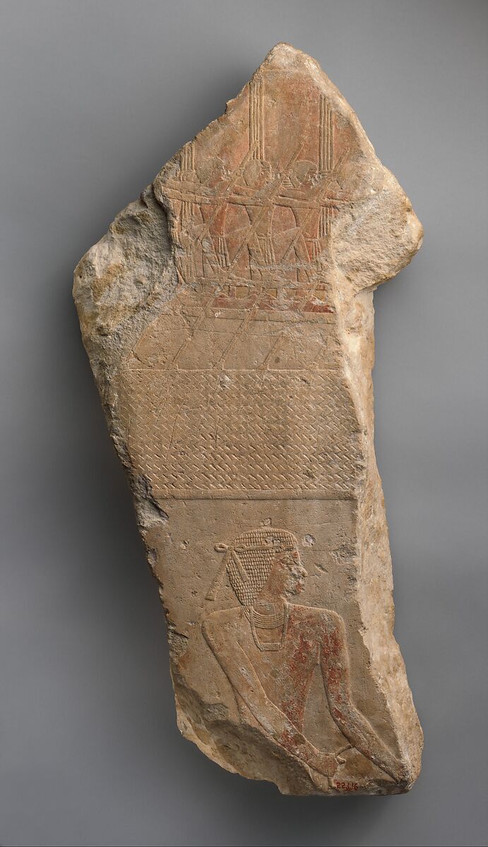 In the lower register, an official wearing a cylinder seal on a cord around his neck seems about to put on another such cord, which he holds in his hands-perhaps an award bestowed by the pharaoh.