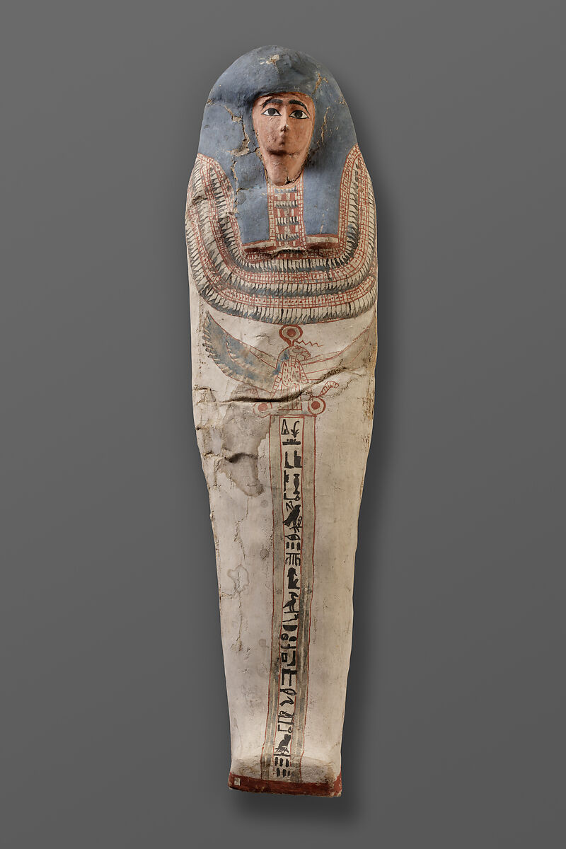 This cartonnage mummy case, along with 06.1232.1, was excavated by John Cardwell, American Consul General in Egypt between 1886 and 1889, at the site of Meidum near modern Cairo. Both of these cartonnages represent a northern Upper Egyptian style seen from Middle Egypt to the Memphite region, and that perhaps may also have been used in the Delta. Elements of the northern Upper Egyptian style that can be noted here are the white background and relatively sparse decoration. A single line of inscription, in this case so corrupted as to be practically unreadable, runs down the center of the front. The figure here wears a tripartite wig in blue and a broad collar that extends to the center of the chest. No hands are visible.