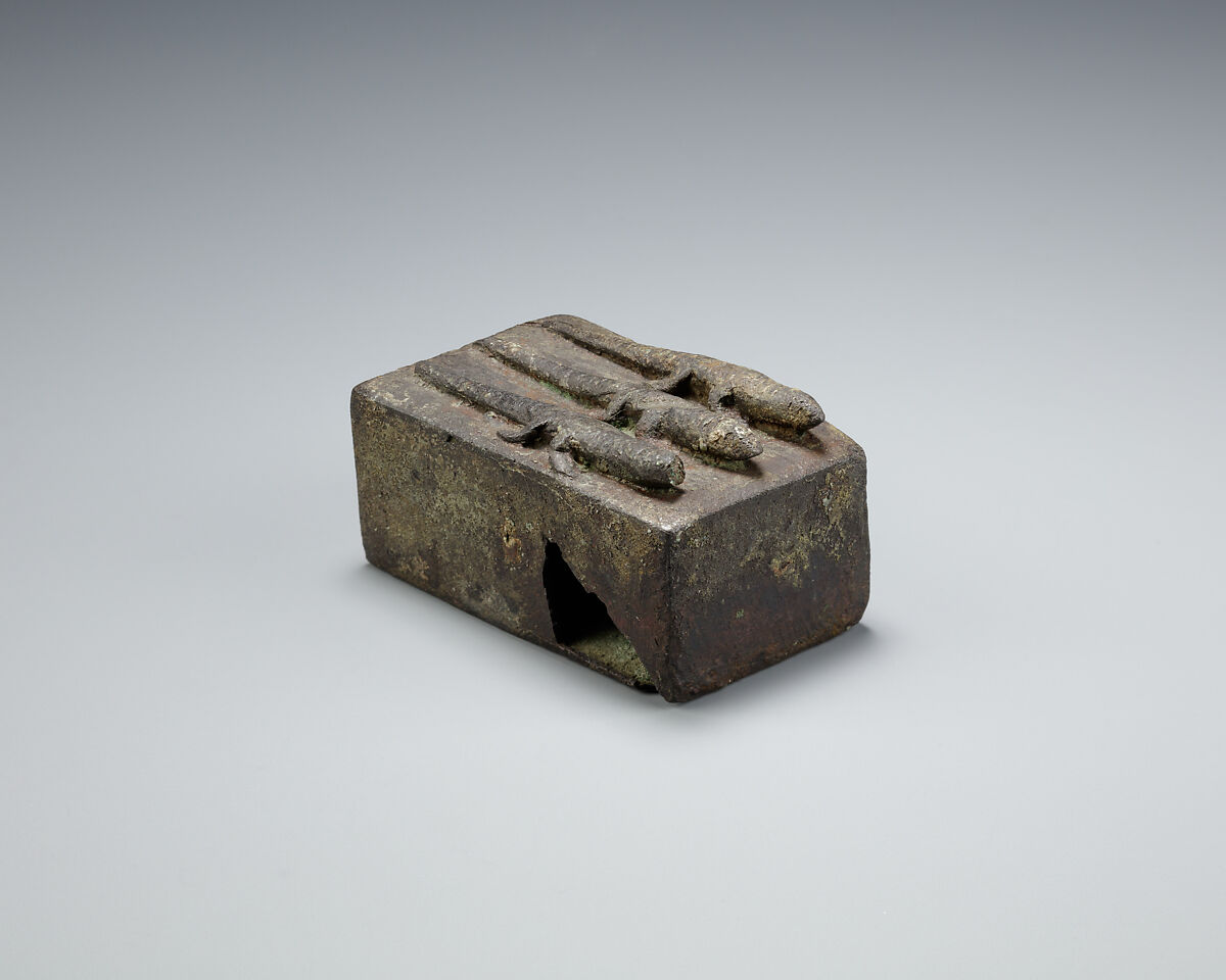 The lizard in later periods of Egyptian history was linked with the creator and solar god Atum, in large part because of their reptilian tendency to warm themselves in the sunshine. Almost all copper alloy representations show the lizards prone, with legs slightly splayed, as if basking in the sun’s rays. Most rest on top of boxes that would have held mummified lizards. On this example, three lizards lay side-by-side, further intensifying the sacred presence of the deity. The box is open at the back for the insertion of one or more mummies. These boxes would have been offered in temples or for deposition in animal necropoleis, not just in honor of Atum, but also in broad connection with other animal representations linked to solar cult, such as shrew mice, ichneumons, or falcons.