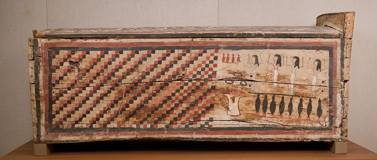 This large rectangular coffin with a slightly arched lid most likely dates to the late 17th or early 18th Dynasty. It has been cobbled together from planks and scraps of sycomore wood. The decoration of the long sides is dominated by checkerboard patterns in black and red, with crudely-painted figural scenes added. On one side are female mourners in white kilts facing an offering stand and piles of offerings; below them is a series of jars set into pot stands. On the other side there are two illustrations, one showing a funerary boat (likely making a pilgrimage to the sacred site of Abydos), and the other, in two registers, depicting offering bearers. On the head end, the goddes Isis stands atop a shrine; an additional panel of wood has been added above this, and two wedjat eyes have been painted here rather than on one of the long sides of the coffin. Nephthys and the mortuary god Anubis in the form of a jackal adorn the foot end . A vertical band of inscription on the lid provides an offering prayer dedicated to the Lady of the House, Teti. Inside the coffin were the mummies of two adults and one child, as well as a faience bowl (26.7.905) and a scarab (26.7.432).