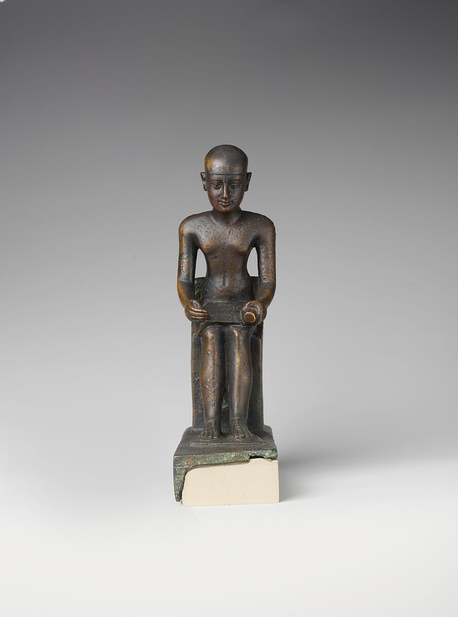 In copper alloy statuettes like this one, he is shown sitting, wearing his close-fitting cap and holding a scroll on his lap. The scroll on this statue is inscribed with the name of Imhotep, and the base is inscribed for a' "servant of Ptah's son" (Imhotep was considered the son of Ptah). The servant’s name was Padisu, son of Hetepsopdu.