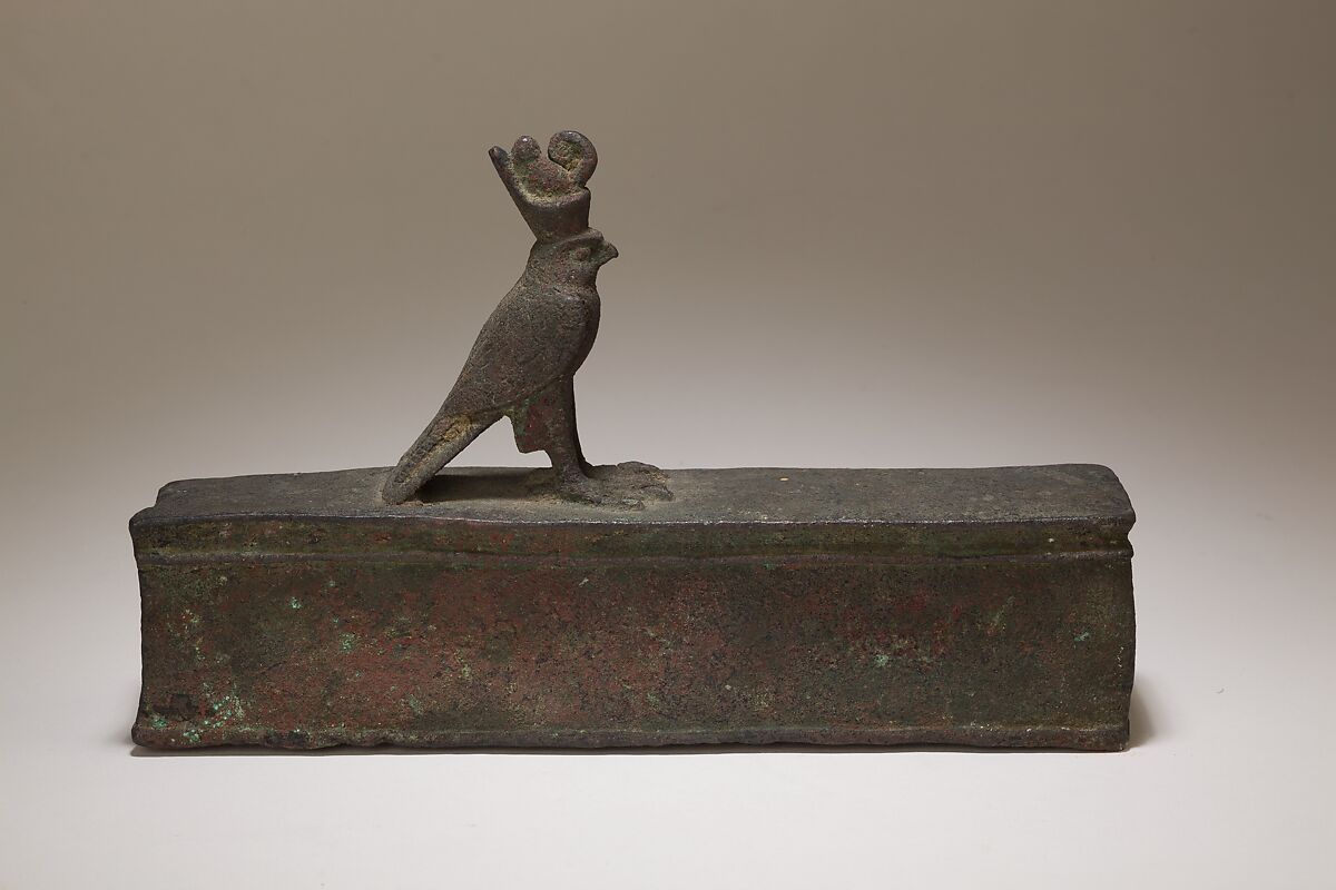 The falcon stands on a rectangular receptacle that would have held an animal mummy. The back end is open where the mummy, now lost, would have been inserted. Such falcon mummy boxes, or sarcophagi, would have been offered for deposition in animal necropoleis, not just in relation to the cult of Horus, but also more broadly in association with solar cult.