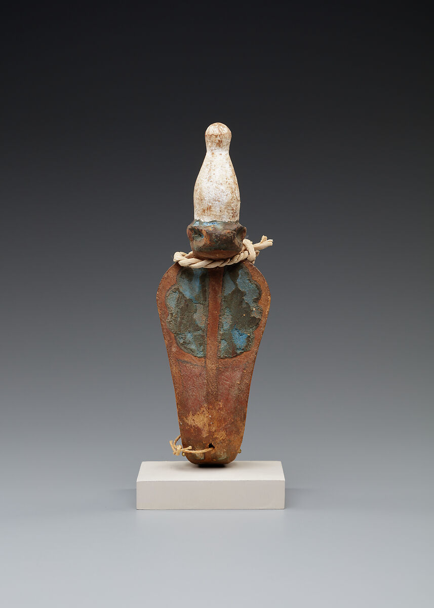 This wooden uraeus (hooding cobra) wears the white crown associated with the south of Egypt. A dowel hole in the back, at the bottom of the snake's body, indicates that it was once attached to something else, most likely a piece of funerary furniture. The purpose of the loop of papyrus cord found around the neck is unknown; this may simply be accidental, as it was found in an embalming cache, mixed in with a great deal of used mummification material.