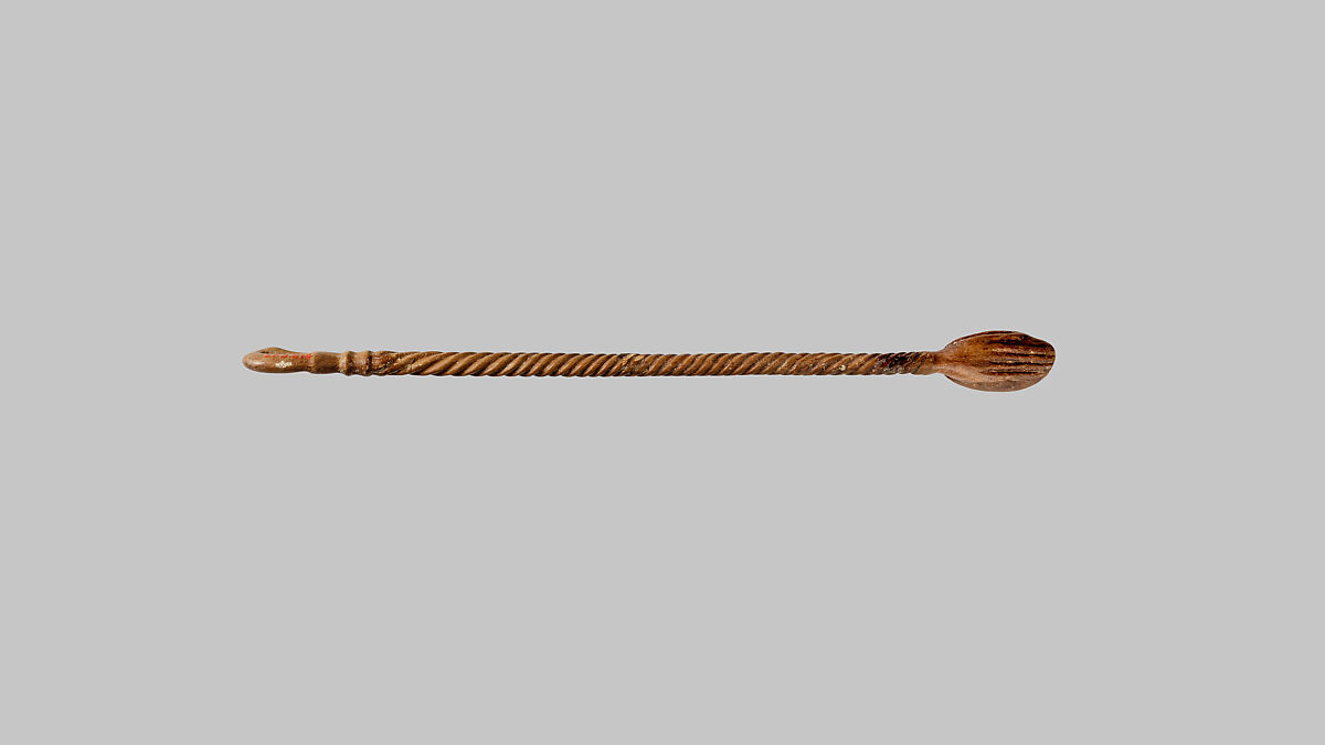 The bowl of this wooden cosmetic spoon is carved in the form of an outstretched hand holding a unionid (a freshwater Nile mollusk). At the opposite end of the long handle is a waterfowl with its head bent backward. This bird is often identified as a duck, but the long neck suggests that it might instead be a goose, associated in other examples with the earth god Geb. The spiral handle here is unusual, as most such shafts are smooth.