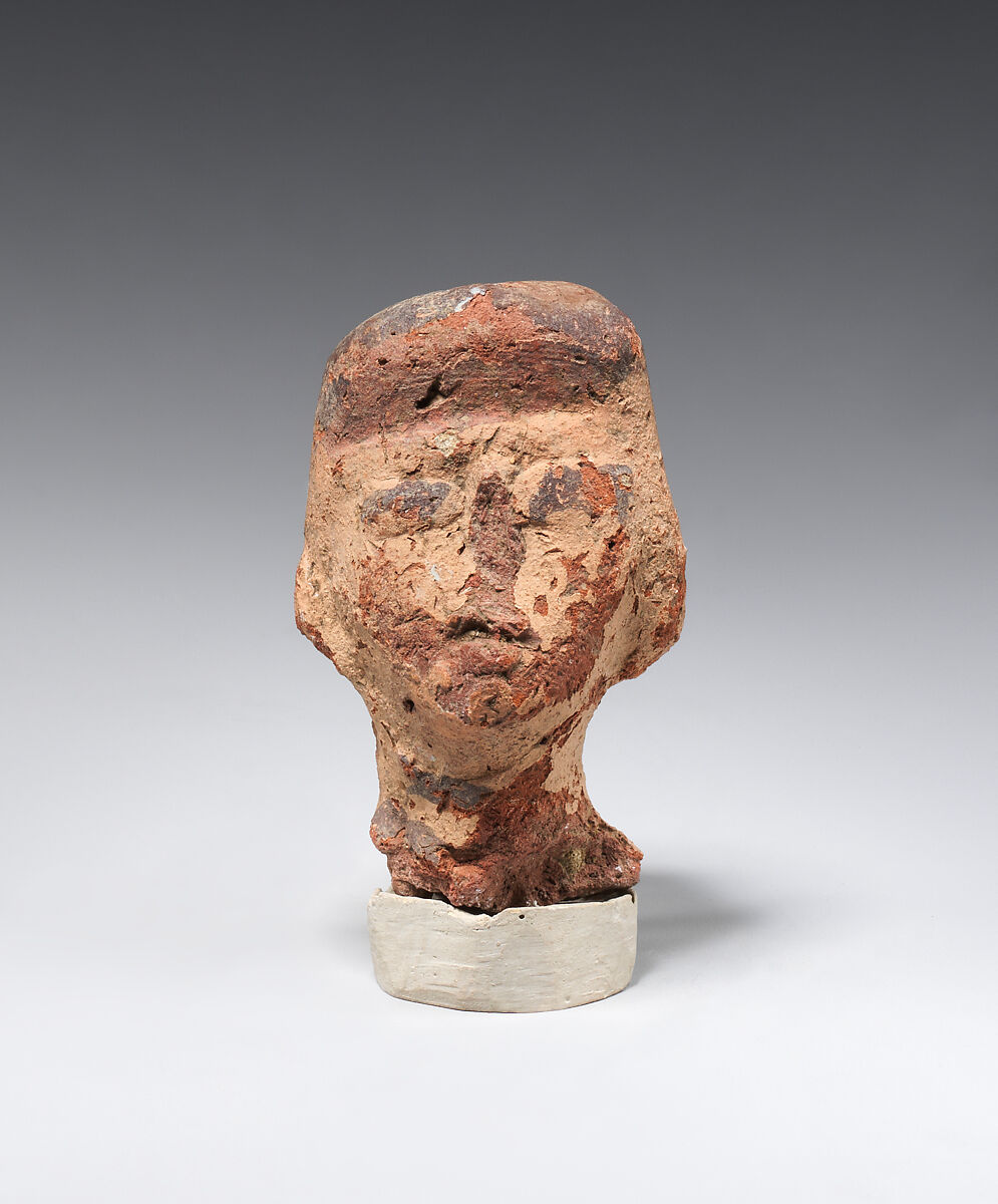 In the area of Ptolemaic brick vaulted tombs in the Lower Assasif at Thebes were found many terracottas. They are only very roughly datable to this period. Possibly the hairstyle of this head is meant to suggest an Egyptian short male hairstyle.The head has a buff slip overall and black marking hair and features.