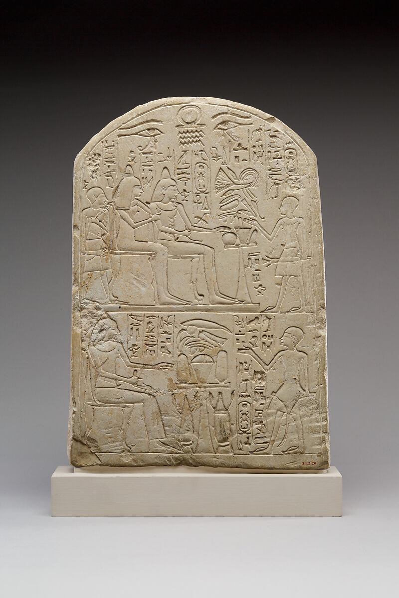 A man named Amenemopet dedicated this stela to members of his family. His father, Pahur, and mother, Mery, are seated at the upper left and receive offerings from Amenemopet. Behind Mery's chair is another son whose name is not preserved. On the lower half of the stela, Amenemopet offers to another male relative whose name is not preserved. Both Amenemopet and his father were priests who attended to the funerary cult of Senwosret I, a Middle Kingdom ruler who had lived some 500 years earlier.
