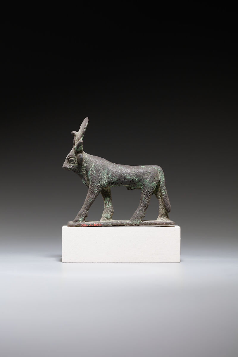 The worship of the Apis bull is attested as early as Dynasty I. Arguably the Apis, unlike many sacred animals in Egypt, was not just favored by a certain deity, but was considered a deity in his own right. A single living representative was stabled near the Ptah temple in Memphis. The bull selected for this important role had certain colorful markings, such as a white triangle on the forehead, and black patches resembling winged birds or scarabs on the body. The bull is often shown, as here, wearing a large sun disc. A triangle on the forehead may also be seen here.