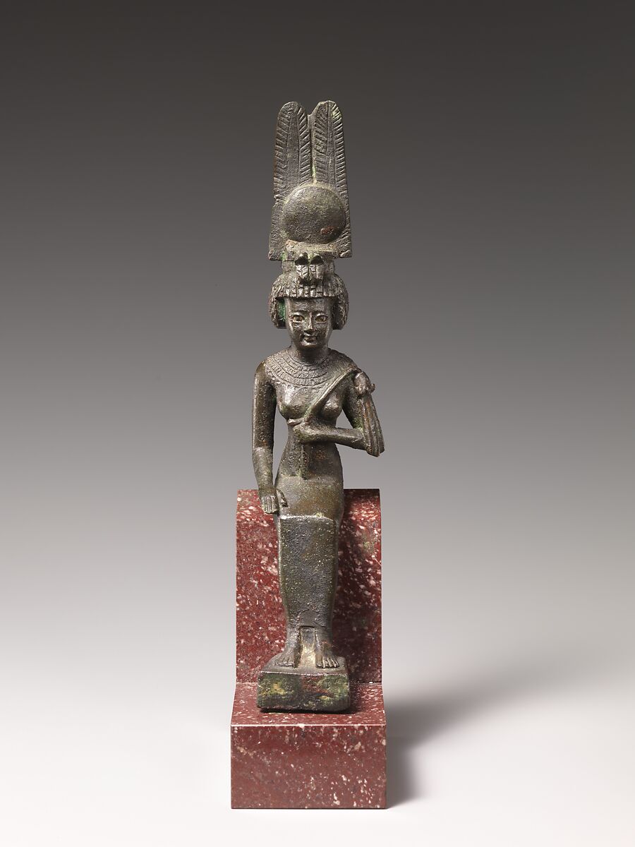 Khereduankh, the mother of Imhotep in late beliefs, received divine status like her son. Typically she wears on her short rounded hairstyle the feather crown and double uraei of an Egyptian queen-like goddess, and carries a queen's flywhisk scepter.