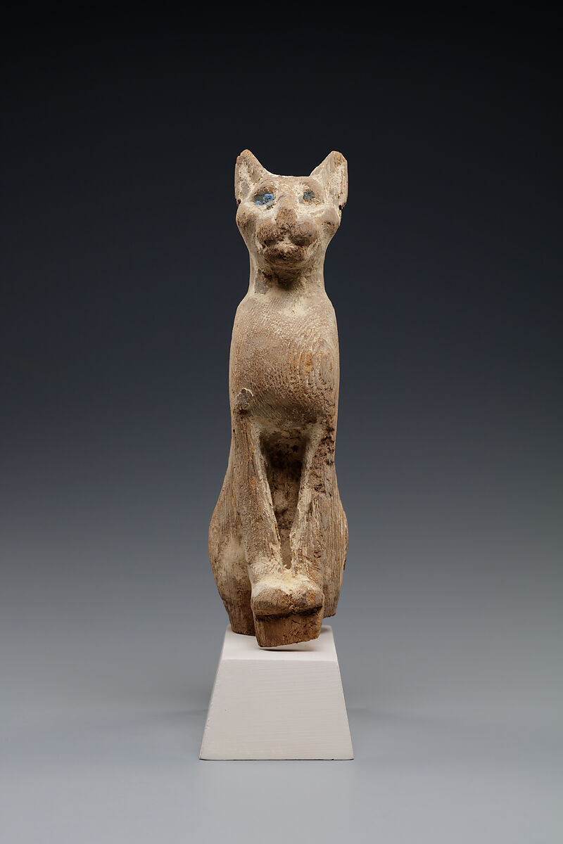 Cat statuettes were among some of the most common zoomorphic dedications of the Late and Ptolemaic Periods. Small statuettes, most often in bronze, wood, or faience, would have been dedicated as offerings to temples or deposited in catacombs alongside cat mummies, as at the extensive catacombs at Bubastis and Saqqara. Sometimes larger hollow examples held a cat mummy inside.