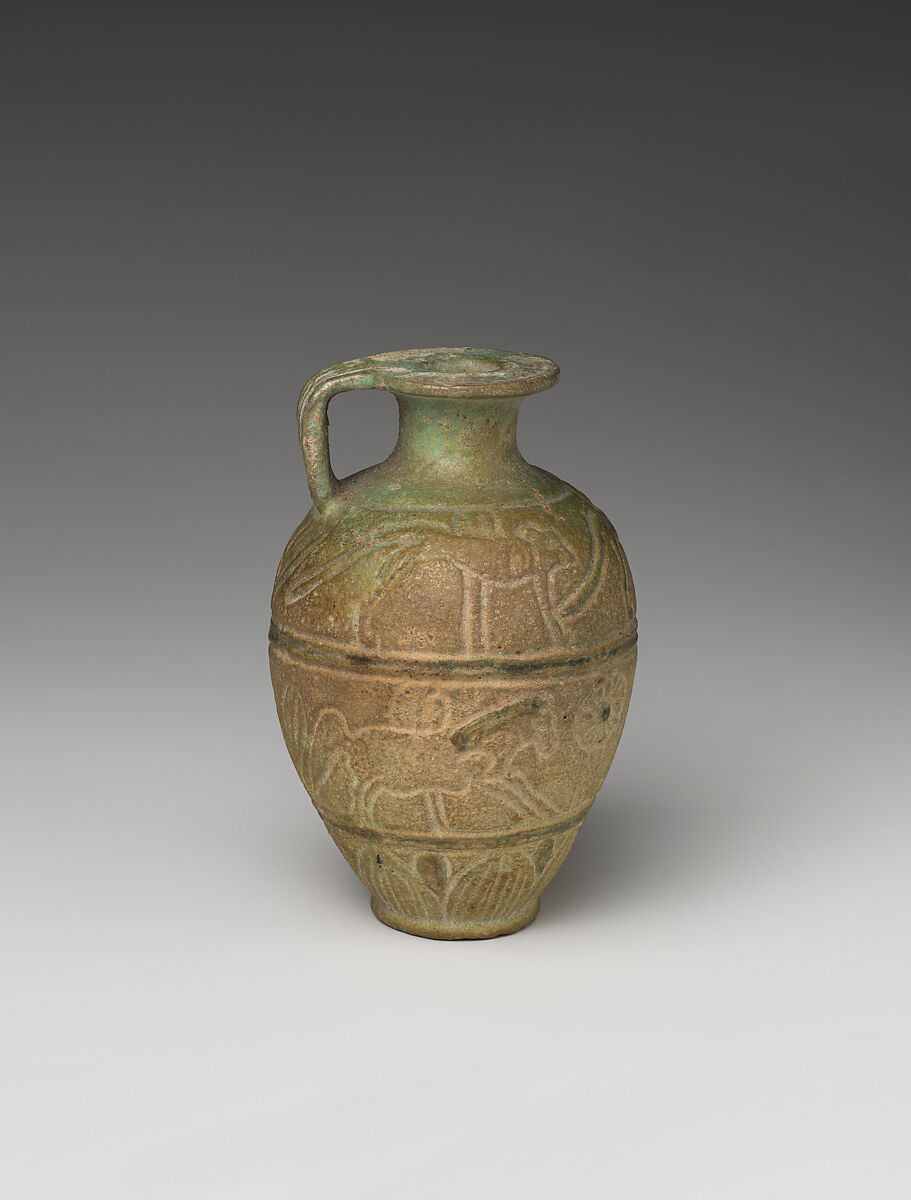 This aryballos has two registers of animals.The uppermost shows lions, and the register around the middle shows stylized horses. An East Greek Egyptianizing workshop produced these vessels incised in low relief. The term East Greek applies to the mingled culture of an area of Greek islands and Ionia.