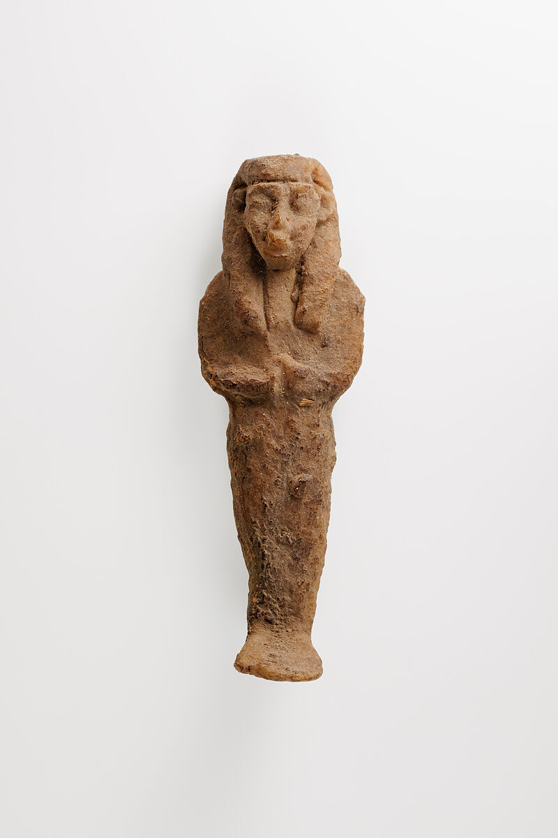 One of four "viscera" figures found in the abdominal cavity of an anonymous female mummy, this was meant to protect the internal organs. It appears that her viscera were lost at some point, so the embalmers had made up the usual seven packets that should have contained organs (see for example 25.3.156a) with random scraps of material, including a coil of rope, a piece of cowskin, and bits of leather and rag. Human-headed, this figure represents Imseti, usually seen as the embodiment and protector of the liver.