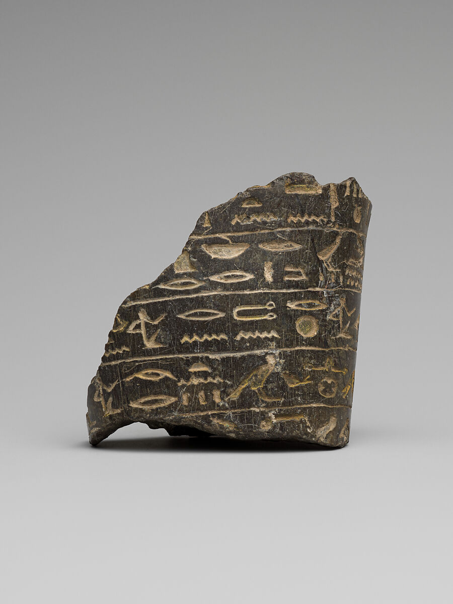 Large stone shabtis, known from the late Middle Kingdom and 18th Dynasty, reappeared in the 25th Dynasty for the pharaohs, Theban God's Wives, and highest officials of Dynasty 25 at Thebes. Mentuemhat, the powerful 'count' of the Theban region, had several such shabtis. Three of them (19.3.5-19.3.7) were excavated by the Metropolitan Museum in the vicinity of his tomb in Western Thebes. This fragment entered the museum before the Egyptian Art Department was founded in 1906.