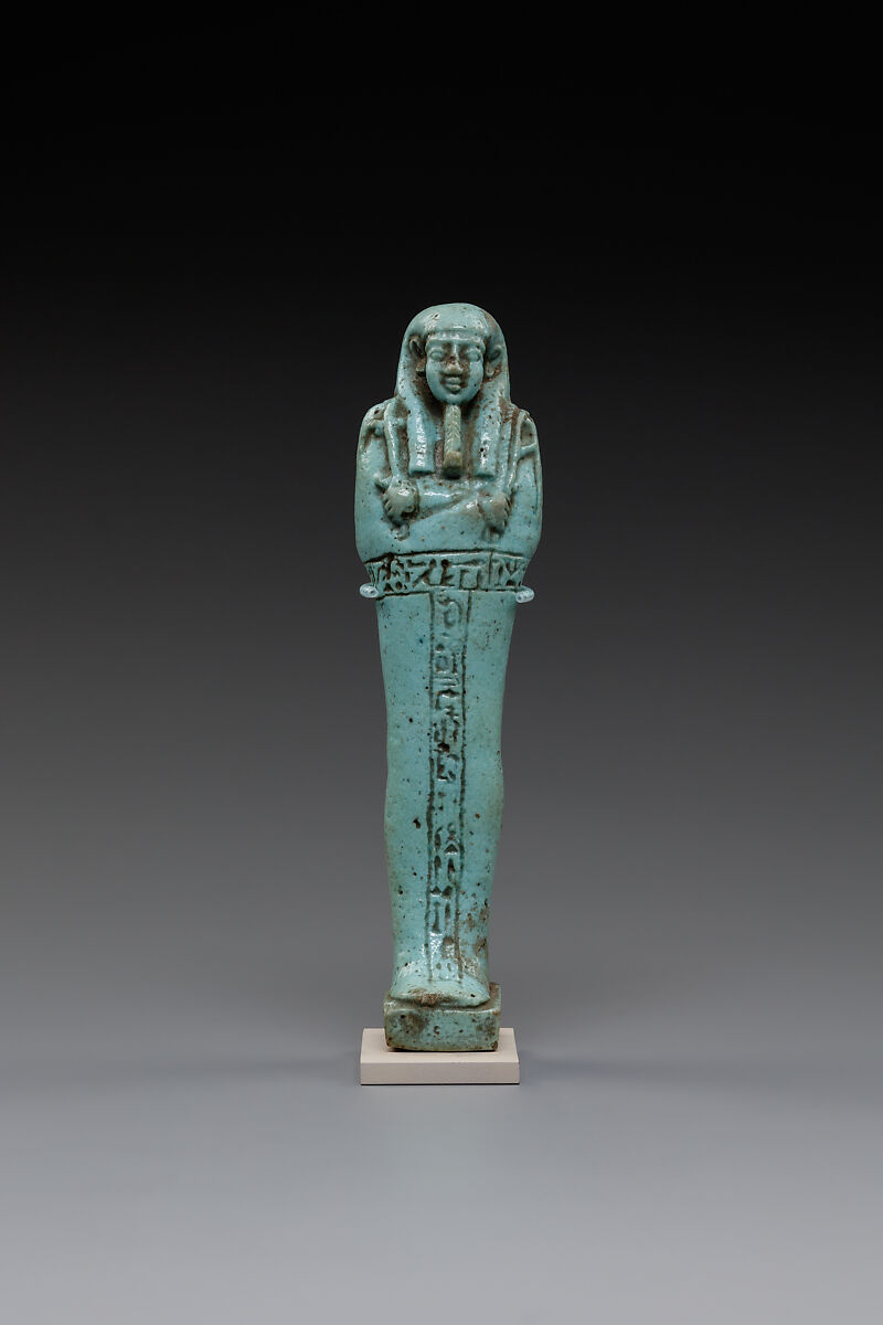This shabti comes from a tomb discovered in 1902 at the site of the ancient city of Mendes (Tell el-Rub’a), the capital of Egypt for a short time during the Late Period. One of the two chambers of the tomb was almost completely empty, with only a few fragments of gold leaf left behind. In the second chamber were over 360 complete shabtis, plus a number of fragments. Most were inscribed, like this one, for the priest Nesbanebdjedet. Of these shabtis, 322 had the type of T-shaped inscription seen here (see also 10.130.1044a). About 100 of Nesbanebdjedet’s shabtis remained in Egypt; many more can be found in museum and private collections around the world.