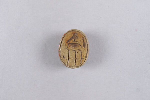 The Egyptian pharaoh had several royal names, the most common one being the prenomen or throne name. Royal titulary also included a Golden Horus name, where the royal name was connected with the Horus falcon who was depicted perched upon the hieroglyph for gold. Both images figure in the upper part of this scarab’s base. The sign for good and beautiful (nefer) and the three palm tree branches together form the expression ‘perfect of years’. This is part of the Golden Horus name of pharaoh Thutmose I (early Dynasty 18, ca. 1504-1492 B.C.).