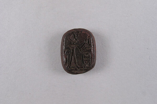 Thutmose III was venerated after his death and the name of this great ruler continues to appear on stamp seals long after his reign, even into the Late Period (ca. 664-525 B.C.). This oval plaque, decorated on both sides, dates to Dynasty 18 during his reign or soon thereafter. One side shows the pharaoh wearing the Blue Crown and offering with both hands a conical loaf of bread. The heqa-scepter is placed behind the king, and in front of him is an oval – a schematic version of the royal cartouche – containing his throne name, Menkheperre.