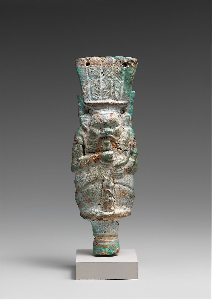 Through their appearance, the figures all allude to the goddess Bastet. In particular, many details evoke the myth termed "The Return of the Faraway Goddess." The feline / leonine Bastet was angry with the god Re and left Egypt for Nubia. Re wanted her back again, so he sent the god Thoth, who, taking the form of a monkey, lured her back with fables. Bes, musicians and dancers accompanied the train of the returning goddess, whose arrival brought the return of good fortune to Egypt. Figures of Bes (2015.11; 04.2.103), the cats (04.2.119, 04.2.120, 21.6.61), the monkeys (44.4.17), the nude females with ‘Nubian’ hairstyles (66.99.71), and the musicians (89.2.217, 17. 194.2441, 17.194.2459, 41.6.7) all relate to this tale; the figure with a conical ‘foreign’ cap carrying a vessel of beer (86.1.55) and the bound oryx behind the feathers of the Bes-image (2015.11) both allude to controlling the goddess’s dangerous nature.