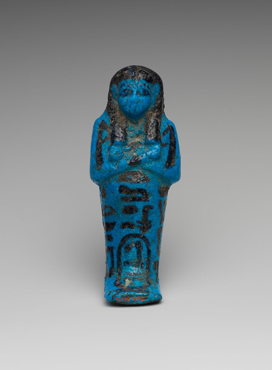 In the ancient Egyptian belief system, shabtis were avatars of the deceased who could be called upon to perform manual labor on his or her behalf in the afterlife. By Henettawy’s time, as many as 401 shabtis (a worker for each day of the year plus an overseer for each 10-day week) were included with the burials of wealthy people. Worker shabtis like this one can be identified by the agricultural tools they hold, whereas overseer shabtis typically wear a skirt and carry a whip. .