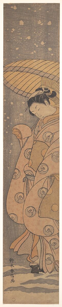 The theme of a beauty in the snow was favored by Harunobu, the innovator of multicolor "brocade" prints (nishiki-e). A narrow vertical frame captures the arresting image of a pensive woman standing in quietly falling snow.