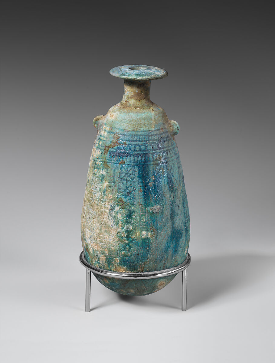 This elegant faience alabastron (defined as an elongated vessel with a narrow neck) may once have held unguents or perfumes. The small lug handles on the sides are not pierced, thus are decorative rather than functional. On one side, a crocodile and ibises in front of lotus stalks are crudely incised. On the other side are bands of rosette decoration with a hieroglyphic inscription between them.