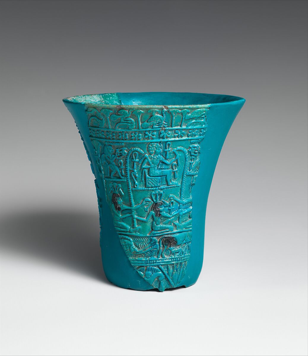 Made of faience glazed a rich turquoise, this goblet takes the shape of the fragrant blue lotus. Reconstructed from eight fragments, it would originally have stood on a slender column imitating the flower's stalk. (For a complete example, see 13.182.53.) This type of chalice, which is seen first in the New Kingdom, appears to have been used primarily as a cult vessel.